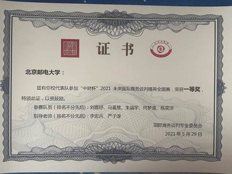由中国管理现代化研究会国际商务谈判专业委员会举办的第十六届“中财杯”2021未来国际商务谈判精英全国赛;于5月29日在中央财经大学落下帷幕。由bat365中文官网入口国际商务专业硕士(MIB)和国际学院同学组成的商务谈判队,在李宏兵副教授和严子淳副教授指导下代表365官网参赛。在北京师范大学、中国政法大学、南开大学、北京外国语大学、中央财经大学、中南财经政法大学、湖南大学等强手如林中突出重围,赛事过程中艰苦备赛、顽强拼搏,凭借出色的现场表现超越多支专业院校的强队,荣获最佳谈判手、优秀谈判手、团队一等奖、优秀教师指导奖等荣誉。上述成绩的取得,得益于学院主管领导和专硕中心老师们的大力支持,也有效地宣传了365官网风采和MIB学生培养的成效。